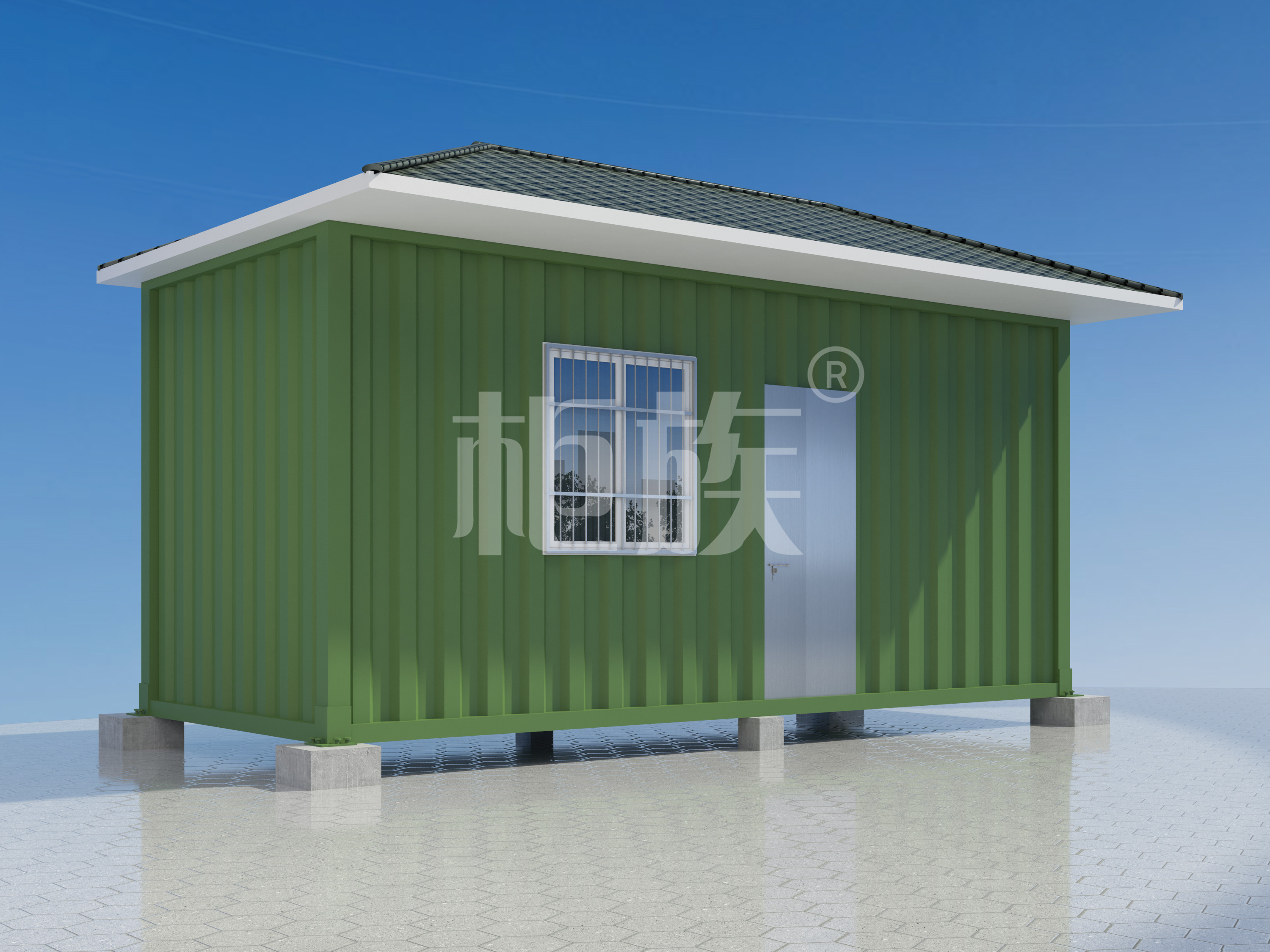 Galvanized rectagular steel tube frame, asphalt tile pitched roof, simply decorated wall. It is beautiful in appearance, good in windproof and moisture-proof, and can be used by fishpond breeding staff.